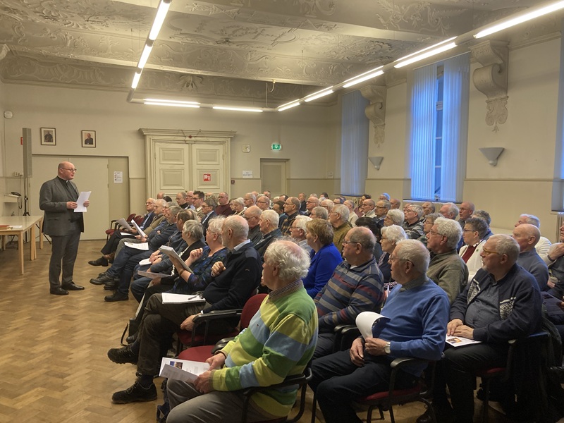 Na een ontvangst met koffie en vlaai was het tijd voor een inhoudelijke bijdrage. Die ging deze keer over het nieuwe lectionarium (lezingenboek) dat vanaf de eerste zondag van de Veertigdagentijd in alle parochie gebruikt moet worden. Gedelegeerde Smeets legde de kosters uit waarom voor een nieuwe vertaling is gekozen en hoe het boek in elkaar zit. Ook ging hij in op het belang van een verzorgde liturgie, waarbij de koster een belangrijke rol in de voorbereidingen kan spelen. “De mis begint niet als de bel klinkt, maar vanaf het moment dat u de deur openzet. Alles hoort dan in orde te zijn.”