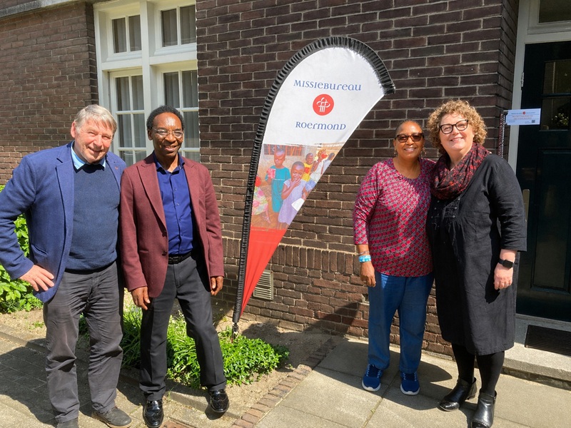 Ilustratie: De delegatie van Pax Christi die het Missiebureau bezocht. Vlnr: Jeroen van de Loo, Sadi Dieudonné, zuster Teresia Wamuyu Wachira en directeur Elianne van den Heuvel van het Missiebureau.