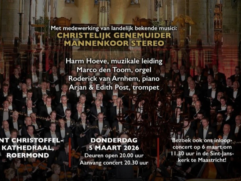 Het 150 leden tellende christelijk mannenkoor Stereo uit Genemuiden (Overijssel) verzorgt op donderdagavond 5 maart een concert in de Sint-Christoffelkathedraal in Roermond. Het concert is gratis te bezoeken en begint om 20.30 uur.