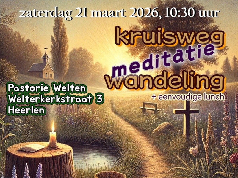 Op zaterdag 21 maart 2026 om 10:30 uur vindt een gewandelde kruisweg plaats door het Welterpark in de Heerlense wijk Welten. De Kruisweg van Jezus wordt overwogen, en zo volgen we al wandelend op meditatieve wijze de laatste tocht van Jezus met zijn kruis onderweg naar Golgota. Hiermee willen we, met beide benen op de grond, dichter bij onze Bron komen