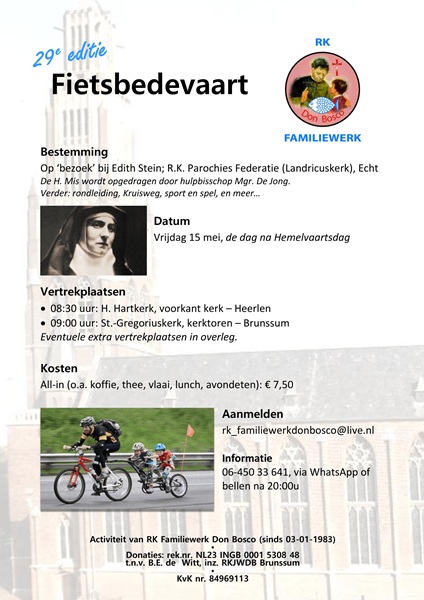 Het R.-K Familiewerk Don Bosco houdt op vrijdag 15 mei (daags na Hemelvaart) een fietsbedevaart vanuit Heerlen/Brunssum naar Edith Stein in Echt.