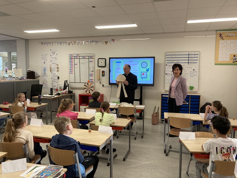 Voor de tweede keer deze week was bisschop Ron van den Hout te gast op een basisschool in Landgraaf. Woensdagmorgen 4 maart bezocht hij De Schatgraver in Schaesberg. Samen met catecheseleerkracht Marie-José Degens gaf de bisschop korte lesjes in zeven verschillende klassen.
